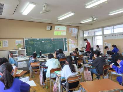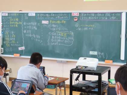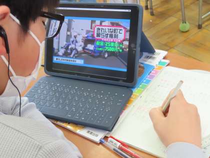 「ここでは」「基本的人権の尊重は国民一人一人を大切にする社会をつくるために必要である」ことを学んでいます。そんなここでの学びを考えながら、ちょうど教室では「ふりかえり」で動画を見ていました。大切なことをメモしている児童がたくさんいました。途中で動画を止めながら見ている子、自分の学習に必要だと思うものを見ている子、繰り返し見ている子など。タブレットの有効活用により、一人一人の児童に応じた学びができ、有効だと感じています。