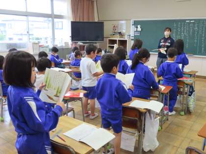 「ふきのとう」ちょうど教室では、みんなで教科書を持って音読の最中でした。でも、ただ音読すればいいわけではありません。今日のめあては、お話の様子がよく伝わるような音読の仕方を考えることです。初めて音読をしたときよりもどんどん上手になっています。「よくできるようになったなあ」と感じることが大事です。毎日のように音読の宿題が出ると思います。各ご家庭でも、お話の様子が伝わるような音読ができるようになっているお子さんのことをたっぷりほめ、音読名人にしてあげてください。