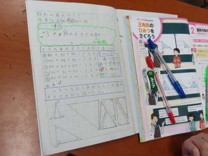 4月22日(月)5年生 算数 公開日 2024/05/20 更新日 2024/05/20 できごと(2024) 「図形の角の大きさ」の学習に入りました。「ここでは」多角形の角の大きさの和を学習します。ちょうど教室では三角形の3つの角の大きさの和をいろいろな方法で調べていました。校長先生も授業を参観していました。5年生の学習への熱心さに感心し、特によいノートを紹介してくれました(写真下)。先生からの教えではなく、自分でこうしていろいろな三角形をつくって地道に調べていくことが大事です。