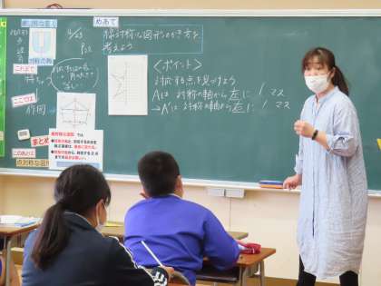「対称な図形」の学習中です。今日は線対称な図形のかき方を考えていました。前時までに線対称な図形の特徴について学習していますので、それらを思い出して、つなげて考えます。「これまで」学習してきた図形を対称という見方、考え方でみると面白い!とたくさん感じてほしいと思います。