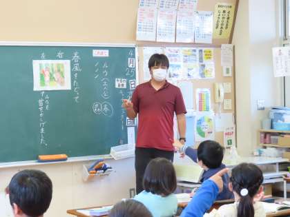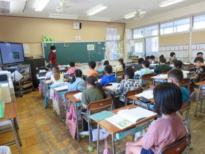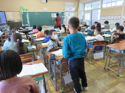 「春風をたどって」を読んで学習しています。教室に入ると、これまで読んできた場面を確認していました。先生からの質問にある児童が答えていました。でも、その児童が伝えたいことがよく理解できない児童もいました。そこで素晴らしかったのは、「わからない」で終わりにせず、「おともだちはどんなことをつたえたかったのかな」と理解しようと努めていたことです。それは自分では考えなかった友達の考えから学ぼうとする姿のあらわれです。違う説明に置き換えて言う子もいました。こういう学び合いが充実できるのが大事です。