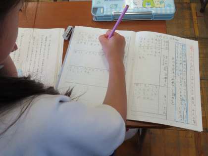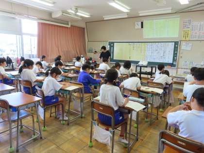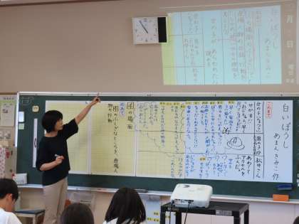 4月25日(木)4年生 国語 公開日 2024/05/20 更新日 2024/05/20 できごと(2024) 「白いぼうし」の学習です。今日は「4」の場面の不思議なところを読み取っていました。「ここでは」登場人物の会話、行動、様子などの言葉に着目して、出来事や心情を捉えて読むことの楽しさをたくさん味わっています。このあともずっと、物語を読み、その世界を楽しむことができるようになってほしいです。