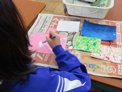 4月30日(火)5年生 図工 公開日 2024/05/20 更新日 2024/05/20 できごと(2024) 「心のもよう」を学習中です。「ここでは」自分の気持ちや心に合う形、色などの特徴を見付け、どう表したらいいかを考え、試し、表現します。ちょうど教室では自分の気持ちを思いのままにかいて「気持ちカード」を何枚もつくっていました。自分の気持ちを表すために・・・これまで学んできた様々な技法を使って工夫していました。