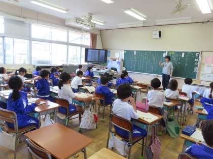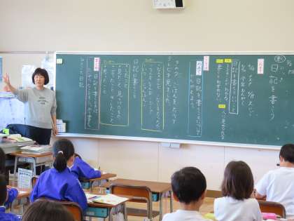 教室に入ると、なんだかワクワクした空気が流れていました。「日記を書こう」の学習で、いよいよ自分の日記を書く学習に入るところでした。「ともだちに つたえたいな」「こんな たのしいことが あったよ」と書きたいことを思い出して考えている児童の表情は楽しそうでした。