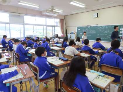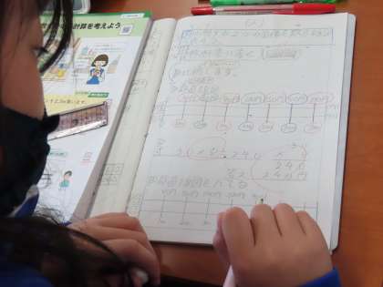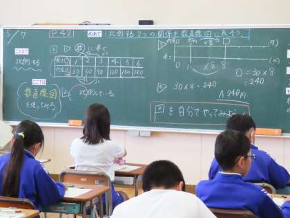 5月7日(火)5年生 算数 公開日 2024/05/20 更新日 2024/05/20 できごと(2024) 「2つの量の変わり方」の学習です。「ここでは」比例という考え方とはじめて出会います。そして今日は、比例する2つの関係を数直線図に表して考えていました。そして数直線図を使って、日常生活でもよく見かける内容の文章題が解けるようになっていました。