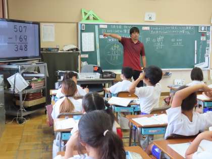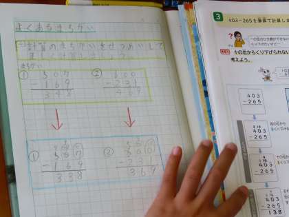 5月7日(火)3年生 算数 公開日 2024/05/20 更新日 2024/05/20 できごと(2024) 「たし算とひき算の筆算」を学習しています。今日は、十の位から繰り下げられないときの筆算の仕方を考えていました。とくに「よくあるまちがい」が例として挙げられ、児童は、自分の口で、何が違っているのか?どう直せばいいのか?しっかり説明することができていました。「まちがいから学ぶ」ことはとても大切なことです。