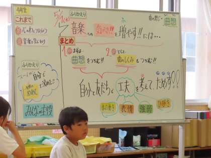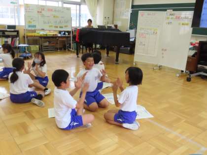 5月8日(水)4年生 音楽 公開日 2024/05/20 更新日 2024/05/20 できごと(2024) 「いいこと ありそう」を楽しく学習中です。「ここでは」曲想や曲の仕組みなどを考えることで、この曲の感じを生かした歌い方を工夫して表現します。そして今日の学習では、自分が感じた曲の特徴を友達と交流しました。もうすでに、児童の歌声から「いいことありそう♪」楽しく優しい気持ちになりました。