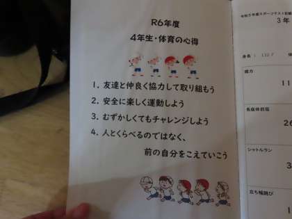5月8日(水)4年生 体育 公開日 2024/05/20 更新日 2024/05/20 できごと(2024) スポーツテストで立ち幅跳びを頑張っていました。体育のノートには昨年度の記録があります。それを確認して、自分の目標を超えられるように頑張っていました。また、友達同士で自然とアドバイスしあう姿も多く見られました。安全第一で、友達と仲良く楽しく、自分自身に挑戦!「体育の心得」がきちんと身に付いています。