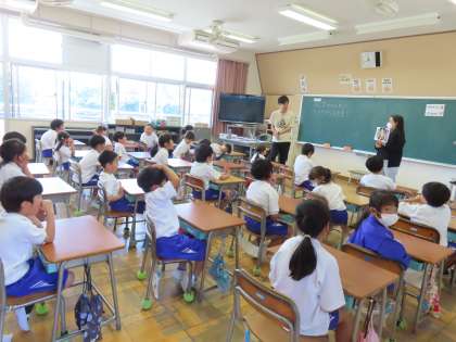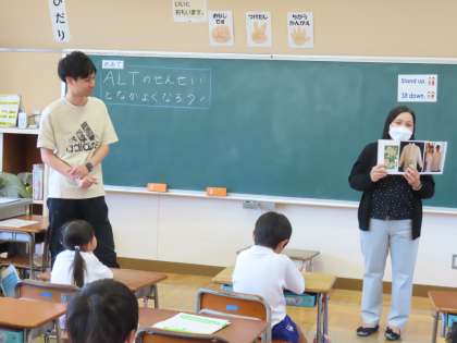 1,2年生の外国語活動の時間は、鬼石中のALTの先生に来ていただいてはじめての英語に楽しんでいます。はじめての時間はALTの先生の自己紹介を英語で聞いてみました。児童だけでなくALTの先生も楽しそうでした。そして廊下で会うとHello!と笑顔で挨拶していました。英語を使っていろいろな国の人たちと関わることを楽しんでほしいです。