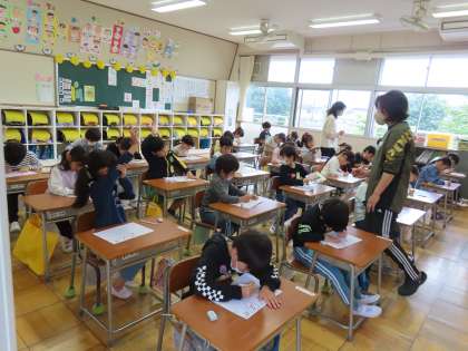 5月13日(月)1年生 国語 公開日 2024/05/20 更新日 2024/05/20 できごと(2024) ひらがなの「ろ」を一生懸命書いて、先生から○をもらっていました。とても上手に書けており、その秘訣は?黒板に友達からのアドバイス(ポイント)が書かれていました。「おりかえすところ」「はらうところ」