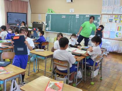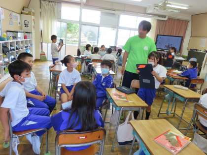 「もっと知りたい、友だちのこと」友だちに知らせたいことを話し、聞き手の友だちが質問していました。その様子をタブレットで撮影し、このあとふりかえります。「ここでは」知りたいことを考えながら聞いたり、さらには話す人が話しやすいように聞きたりすることを考えます。よりよい人間関係のために、聞くことが大事だということを学んでいます。