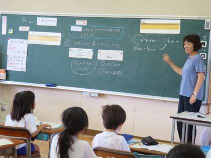 「長さのたんい」の学習では、3cm4mmと29mmの長さ比べを考えることで、cmとmmの関係について調べていました。先生は児童に、「その理由は?」とよく聞いていました。学んできていることとつなげて、どうしてそうなったのか?を考えるからこそ、しっかり身に付いていきます。