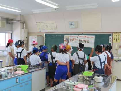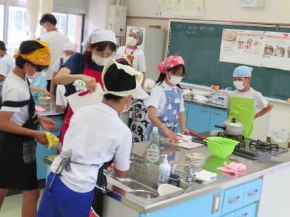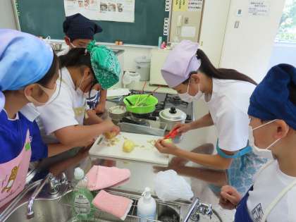 6月4日(火)5年生 家庭科 公開日 2024/06/04 更新日 2024/06/04 できごと(2024) 「クッキング はじめの一歩」の学習をしています。今日は3クラスとも、栄養教諭にお世話になりました。「ここでは」じゃがいもをゆでる学習を通して、切る大きさや鍋に入れるタイミング、ゆでる時間に注意して調理することの大切さに気付きます。みんなで協力してゆでた後は、おいしくいただきました。まさに「はじめの一歩」を学習し、「このあとは」様々なじゃがいも料理にも挑戦してほしいですね。