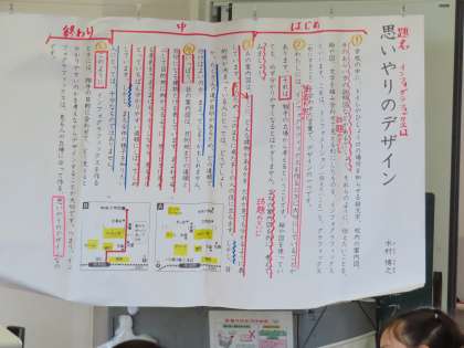 6月5日(水)4年生 国語 公開日 2024/06/05 更新日 2024/06/05 できごと(2024) 「アップとルーズで伝える」を学習しています。「これまで」の「思いやりのデザイン」での学習を生かして学んでいます。「ここでは」文章の組立や段落どうしの関係に気を付けて読み、筆者の考えを捉えることができるようになります。そしてここでの学習は「このあとは」人に伝えることがもっと好きに、そして上手にできるようにもつながります。
