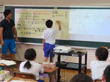 「電流のはたらき」の学習をしています。ちょうど教室では、児童が夢中になって頭を働かせていました。今日の問いは「モーターをもっと速く回すにはどうしたらよいだろうか」そのために、「これまで」実験を通して得た知識をフル活用して予想し、そのための実験方法を考えていました。友達の考えを受け止め、さらに「付け足します!」どんどん考えていました。