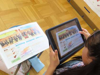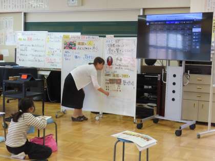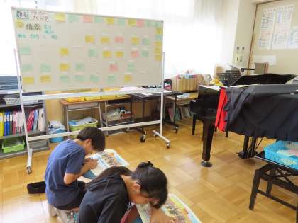 「アイネ クライネ ナハトムジーク第1楽章」を鑑賞し、初めて聴いた感想を付箋に書いて提出していました。付箋の色は自分の感じた音楽の色を選びました。また弦楽器だけの演奏なのになぜこんなにも音の響きが豊かになるのを感じるのか?という問いに自分なりの考えを書き、タブレット上で共有します。「ここでは」このような学習を通じていろいろな楽器の特徴を知り、旋律の重なりの移り変わり、弦楽合奏の響きの美しさなどをたっぷり味わっています。