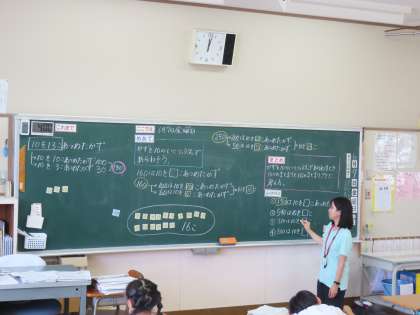 「100より大きい数」の学習では、大きな数を「10の いくつ分」であらわすことができるようになりました。ちょうど教室では「ふりかえり」問題に挑戦し、答え合わせをしていました。数のいろいろな見方や考え方を身に付け、「このあとは」どんどん数字が大きくなり、間もなく計算までできるようになります。