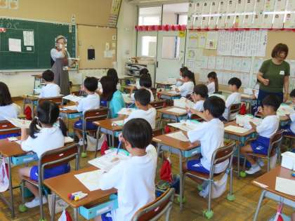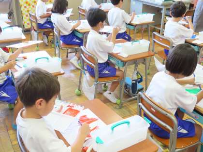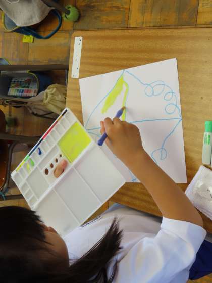 6月11日(火)1年生 図工 絵の具講習会(1−1) 公開日 2024/06/11 更新日 2024/06/11 できごと(2024) クレヨンや色鉛筆で「かく」楽しさを味わってきた1年生です。今日は新しく、「絵の具セット」が加わりました。はじめて使う絵の具を、どうやって使うのか?講師の先生にお世話になって教えていただきました。写真は1組の様子です。