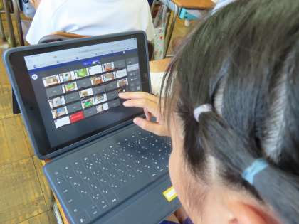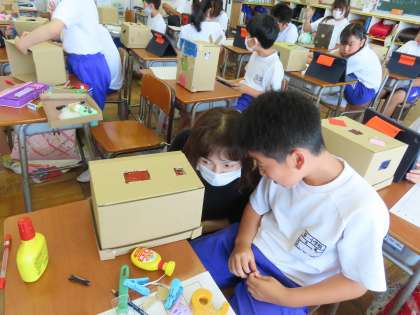 6月11日(火)5年生 図工 公開日 2024/06/11 更新日 2024/06/11 できごと(2024) 教室に入ると、担任の先生が、児童の作品の中を楽しそうにのぞいていました。まさに学習しているのは「のぞいてみると」です。「ここでは」箱の中に自分の世界をつくりあげます。そして、できあがった作品はタブレット上で展覧会開催中です!つくった児童の解説を聞きながら鑑賞させてもらいました。