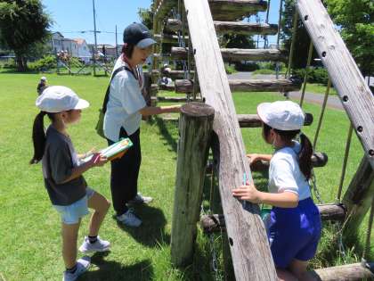 6月19日(水)2年生 国語 公開日 2024/06/19 更新日 2024/06/19 できごと(2024) 「こんなもの 見つけたよ」の学習のスタートは、ミニまちたんけんです!「ここでは」町の中で見付けたいいな!すてきだな!ともだちにつたえたいな!を文章に表現して知らせることを学習します。みつけたもののよさがよく伝わるように組立を考えることも学びます。 そこで、今日は、学年みんなで近くの総合学習センターまで行き、見つけたものについてメモをとりました。