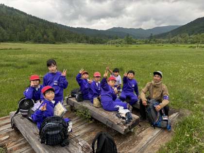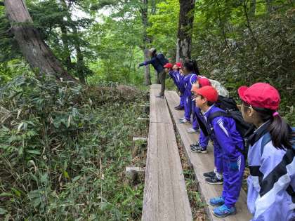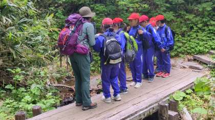 散策が始まった様子です。ガイドさんの話をよく聞いています。