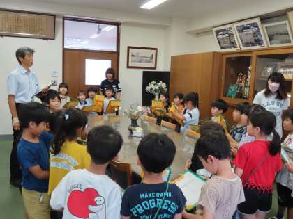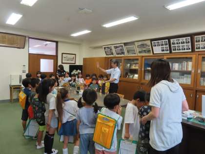 7月1日(月)1−1「こうちょうしつたんけん」(生活科) 公開日 2024/07/01 更新日 2024/07/01 できごと(2024) 今日は1組、明日は2組、明後日は3組が「こうちょうしつたんけん」をします。普段はなかなか入室できない校長室で、校長先生に質問したり、校長室にあるものを記録したりしていました。「こうちょうせんせいは、いつも こうちょうしつで なにをしていますか?」との質問に、校長先生は「みんなといっしょです。おべんきょうをしています」と答えており、1年生は驚いていました。