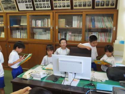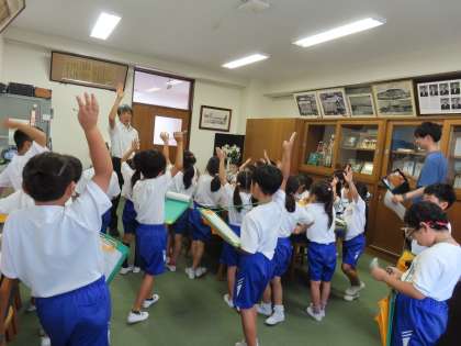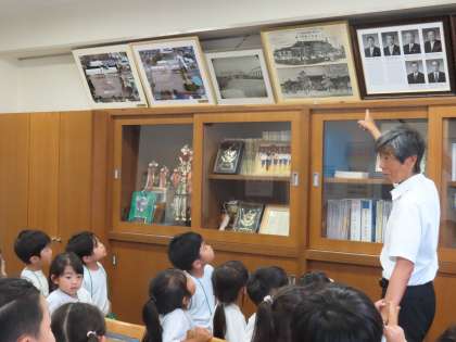 7月2日(火)1−2「こうちょうしつたんけん」(生活科) 公開日 2024/07/02 更新日 2024/07/02 できごと(2024) 今日は2組でした。校長先生への代表質問のあとは、校長室にあるものについて質問攻めでした。特に藤岡の「笑うはにわ」や不審者対策用の「さすまた」、「歴代校長先生の写真」や「創立150周年の航空写真」は児童に大人気でした。