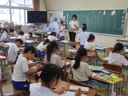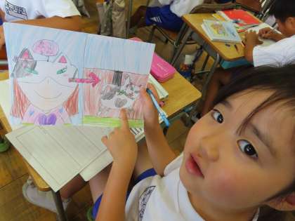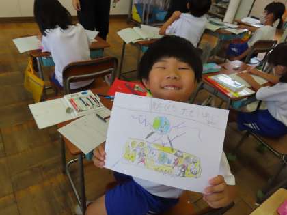 7月8日(月)2年生 国語 公開日 2024/07/09 更新日 2024/07/09 できごと(2024) 「あったらいいな、こんなもの」絵をかいて、友達と質問しあってさらに詳しく考えて、発表します。教室では夢中になって自分の絵をかき、先生に見てもらいたくて見てもらいたくて仕方がない様子でした。このような学習活動を通して「ここでは」質問をして相手の考えを詳しく聞くことを学びます。児童の絵をみていると、「聞いてみたいな」と思うような絵ばかりです。2年生の想像力の豊かさ、楽しさに感心感心。