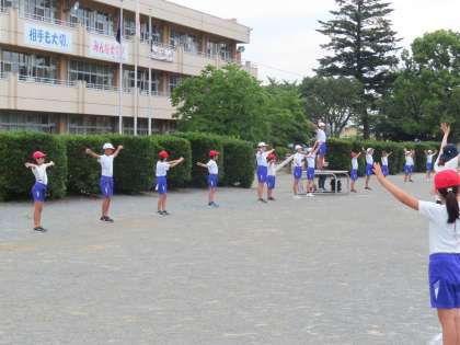 7月9日(火)体育集会 公開日 2024/07/09 更新日 2024/07/09 できごと(2024) みんなで楽しく体を動かしました。とても短い時間でしたが、元気よく大きく体を動かしました。今日も体育委員会児童が中心となって行いました。暑さ指数とにらめっこする毎日が続いているので、無理なくこうして外で思い切り体を動かせる貴重な時間を大事に過ごしました。
