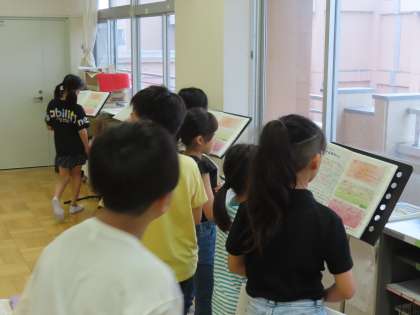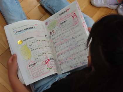 音楽室では、この1学期間の学習を振り返っていました。音楽室じゅうを囲んでいる上級生のノートを参考にしたり、「これまで」学習してきた自分のノートを見返したりしながら、この1学期にできるようになったことや新しく知ったことを自分の言葉でまとめます。こうすることで、「このあと」2学期以降に「もっとできるようになりたい!」「もっと知りたいな」「挑戦してみたいな!」がたくさん生まれてきたことでしょう。児童の学習はこうしてやる気や期待感とともにつながっていきます。