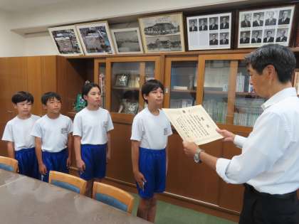 この快挙!素晴らしい努力の成果は、先日もこのHPでお伝えした通りです。今日の昼休みに校長室で表彰式を行いました。もちろん全校児童にも紹介しました。あらためて報告いたします。おめでとうございます。