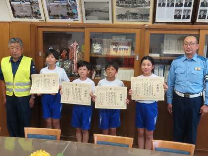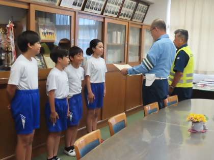 この日の午後、藤岡警察署、藤岡交通安全協会、藤岡市交通対策協議会の方々が自転車大会4選手のためにご来校くださいました。藤岡警察署長様、交通安全協会長様からの「感謝状」を4名の児童に贈呈してくださいました。