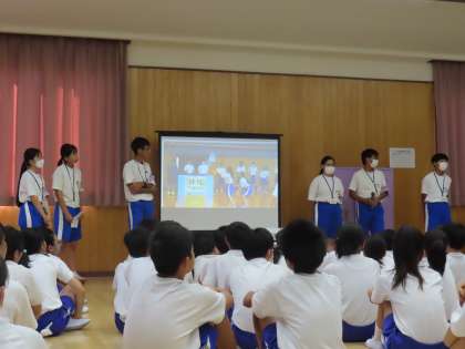 9月6日(金)東中生チャレンジウィーク最終日2 公開日 2024/09/06 更新日 2024/09/06 できごと(2024) 6時間目に、中学生6名は、6年生全員を目の前に、中学校生活について紹介しました。自作のスライドを使ってとても分かりやすく発表しました。準備してきた原稿を読むのではなく、自分の言葉で、「中学校生活楽しいよ!」気持ちをこめて発表しており、6年生は真剣に聞いていました。第一っ子にとってみたら、目標となる先輩としての姿をたくさん示していた中学生でした。