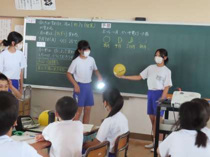 9月9日(月)6年生 理科 公開日 2024/09/09 更新日 2024/09/09 できごと(2024) 「月の形と太陽」の学習に入りました。月の形が日によって変わるのはどうしてなのか?ボールに光をあてて月の見え方を調べています。そしてこのあと、ここでの実験をもとに考察します。6年生にもなると、この考察がどう進められるかが肝心で、理科の学びを深める上でとても大切な学習過程です。