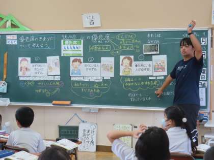 「心の優先席」を通して、みんなが気持ちよくすごすためのきまりについて考えました。3年生の児童も見たことのある優先席に関する3人の意見を聞いて、自分はどう思うか考えました。黒板の全員の考えを見ると、みんな同じではありません。だからこそ自分と違う考えの友達の声に耳を傾けたくなるものです。こうしてお互いに考え、伝え合いながら心を豊かにしていく3年生です。