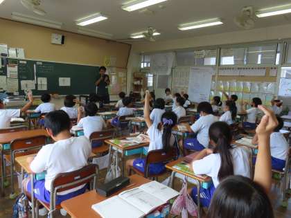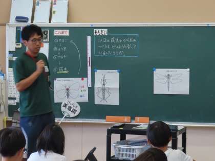 「こん虫のかんさつ」の学習はとても楽しそうです。今日は昆虫の成虫の体のつくりを学習しています。「これまで」学習したチョウの体のつくりのことを思い出して、「ここでは」バッタとトンボの体のつくりを調べて学習します。先生から学習課題が示されると、あちこちから知っていることが飛び交います。3年生はみんな昆虫博士です!