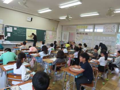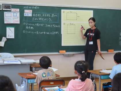 「三角形と四角形」ちょうど教室では、長方形、正方形、直角三角形をかき始めているところでした。定規を使って丁寧に、これまで学んできた特徴を再確認して・・・いろいろな形の図形があることを知って、図形の学習をもっともっと好きになってもらいたいです。