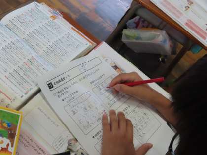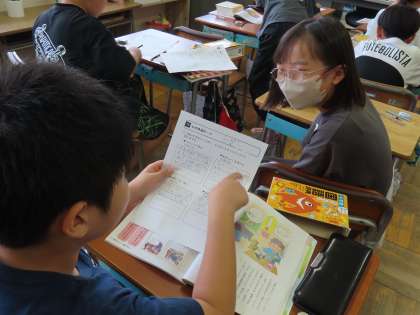 「心の温度計」を通して自分自身の生活を「度がすぎないように」という点で見つめ直し、今日からの生活の目標を考えていました。ちょうど教室では、友達とお互いの考えを交流しあっていました。「あなたはそう考えたのね」「自分はこう考える」「○○さんの考えもいいなあ」道徳では、よりよい生活のために、こうして友達との学び合いのなかで前進しています。そして、感心したのは、国語辞典を使って、しっかり漢字で記述する4年生!こうやって一文一文丁寧に書くことにより、さらに自分の考えたことが大切なものとなります。