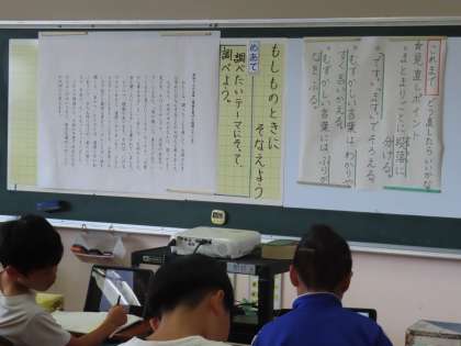 「もしものときにそなえよう」の学習に熱中しています。今日は調べたい!と思ったテーマについて調べていました。でも調べるだけではなく、それを自分の考えとともに友達に発信します。説得力のあるうものにするには文の組立を考えなければなりません。そんなことも意識しながら調べていました。