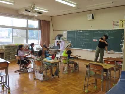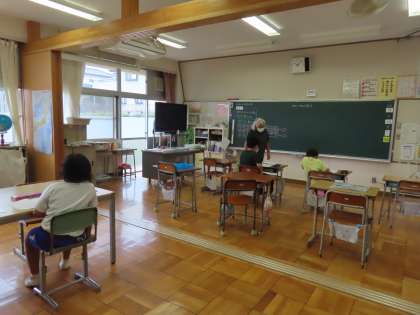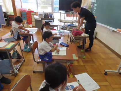 2組では3年生が算数で等号、不等号を学習していました。ちょうど教室では「まとめ」をしていて、学習した等号と不等号を先生と一緒に体で表現していました。「べんりだね!」と今日学習したことを先生とふりかえっていました。