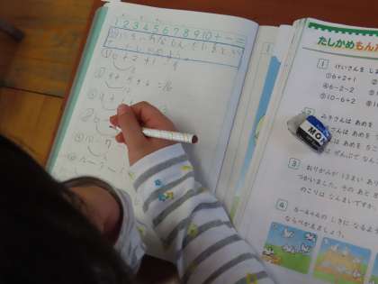 とても姿勢がよく、本当によく集中して計算問題を解いていたので、先生が誉めていました。本当に見事な集中力でしたので、「日本一?世界一?宇宙一?の算数博士もんだね!」と最高の誉め言葉をおくりました。