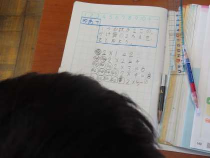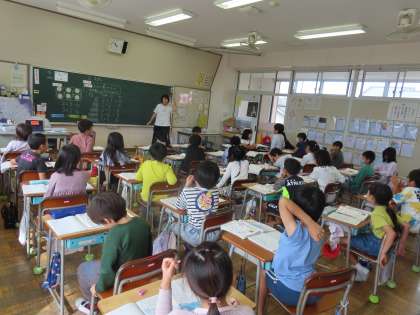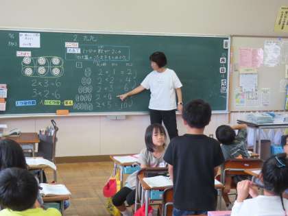 10月16日(水)2年生 算数 公開日 2024/10/16 更新日 2024/10/16 できごと(2024) いよいよかけ算九九の学習に入りました。今日は1皿に2個ずつのお寿司がのっている場合のお寿司の数を1皿から順に求める方法を考えていました。2×1=2、2×2=4・・・と順番に5皿分まで。何か気付いたことは?いろいろな意見が出されました。友達の発言を一生懸命聞いている2年生の目がとてもよかったです。