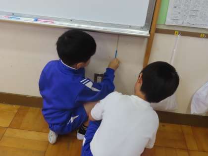 10月18日(金)1年生 算数 公開日 2024/10/18 更新日 2024/10/18 できごと(2024) 「ながさくらべ」の学習です。今日は、「なにかの いくつぶん」で調べることができる!いいことに気付きました。鉛筆や消しゴム、自分の指を一生懸命使って、教室内の色々な場所の長さを調べてノートにメモしていました。いつもの生活のなかでも役立ちますが、このあとの算数の学習でも大切な考え方のヒントにつながりますよ!
