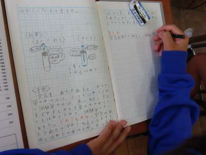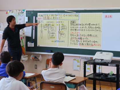 10月21日(月)4年生 理科 公開日 2024/10/21 更新日 2024/10/21 できごと(2024) 「物の体積と温度」の学習に入りました。今日の問いは「空気はあたためられたり冷やされたりすると体積は変わるのか?」実験の結果から分かることを考察していました。考察はしっかり自分の頭で考え、自分の言葉でまとめます。こうしてどんどんまとめる力がついていきます。先生も大変誉めていました。
