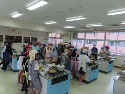 写真は2組の様子です。今日のめあては「手際よく」です。班の友達と協力しながらよく取り組んでいました。栄養士の先生にも教えていただきます。