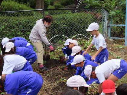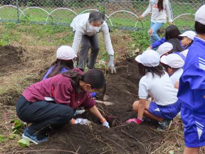 11月6日(水)2年生 生活科 さつまいも収穫(東クローバー協力) 公開日 2024/11/06 更新日 2024/11/06 できごと(2024) 今日は2年生にとって、待ちに待ったさつまいもの収穫日。今日は東クローバーの皆様(婦人会の皆様)がご来校くださり、収穫を手伝っていただきました。おかげさまで、2年生は大喜び。素晴らしい経験をすることができました。ありがとうございました。