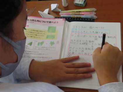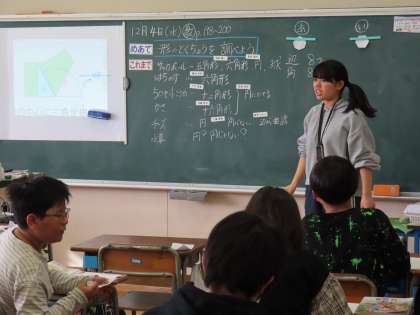 12月4日(水)5年生 算数 公開日 2024/12/04 更新日 2024/12/04 できごと(2024) 「正多角形と円」の学習に入るようです。今日は、教科書に掲載されている写真(サッカーボール、傘、水車など)を見て、その特徴はなにか?考えていました。「ここでは」さらに図形の見方や考え方を広げ、深めていき、図形の学習の面白さをたくさん味わうことでしょう。