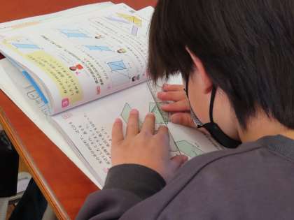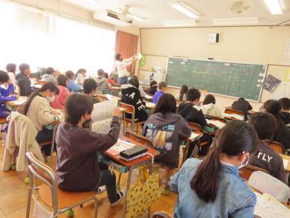 1月9日(木)5年生 算数 公開日 2025/01/09 更新日 2025/01/09 できごと(2024) 3学期は「四角形と三角形の面積」の学習から始まります.今日は、平行四辺形の面積を求める公式を自分の力で考え出しました。そしてちょうど教室では、振り返りをしているところでした。自分の力で考え出した公式なので、とても意欲的、真剣です。さらにいろいろ試したくなるものです。