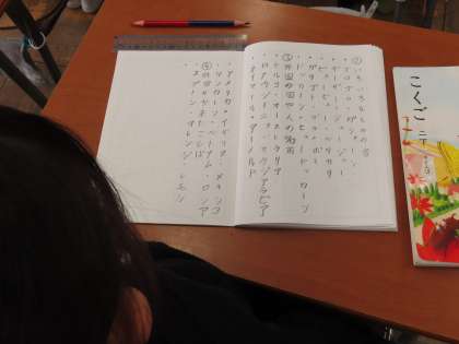1組と2組では、「かたかなで書くことば」を学習していました。「ここでは」文章を書くときに平仮名と片仮名を使い分けて書くことを学習します。ちょうど教室では片仮名で書く言葉を分類していました。黒板にはネームプレートとともに、たくさんの言葉が書き出されていました。