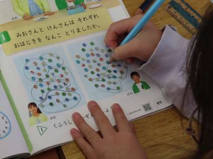 1月16日(木)1年生 算数 公開日 2025/01/16 更新日 2025/01/16 できごと(2024) 「大きなかず」の学習に入りました。「ここでは」これまでに学習してきた数よりも大きな数のことを理解できるようになります。教科書に載っているおはじきの写真を見て、そのおはじきの数を工夫して数えていました。「これまで」学習してきたやり方(10のかたまり、2・4・6・・・)で一つ一つ丁寧に数えていました。